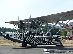 During the 1990s two reproduction S-38s were built by the late Buzz Kaplan's “Born Again Restorations,” of Owatonna, Minnesota.[10] One was produced for Samuel Curtis Johnson Jr., the son of Herbert Fisk Johnson, to recreate his father's flight, which he completed in 1998. As of August 2017 the plane is suspended from the ceiling of Fortaleza Hall in the S. C. Johnson & Son company headquarters in Racine, Wisconsin .[11] The other S-38 replica, N28V, appeared in the movie The Aviator (2004), a story loosely based on the life of Howard Hughes, who owned an S-38 during his lifetime. As of August 2017 it is owned by Kermit Weeks and located at the Fantasy of Flight Museum in Polk City, Florida, bearing the Osa's Ark paint scheme.[12][13]