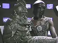 Sil also features in the Philip Martin's novelisation of the never-made serial Mission to Magnus, in which he was in league with the Ice Warriors. Big Finish Productions released a new audio version of Mission to Magnus in December 2009, with Nabil Shaban reprising his role as Sil. Sil made another appearance in the Big Finish Audio story Antidote to Oblivion in 2014 alongside the Sixth Doctor and Flip.[1] A script was pitched for the never-produced Season 27 where he would return along with the Autons and UNIT.[2]