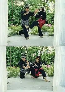 Silat Melayu (Jawi: سيلت ملايو), also known as Seni Persilatan Melayu[1] ('art of Malay Silat') or simply Silat, is a combative art of self-defence from the Malay world, that employs langkah ('steps') and jurus ('movements') to ward off or to strike assaults, either with or without weapons. Silat traced its origin to the early days of Malay civilisation, and has since developed into a fine tradition of physical and spiritual training that embodies aspects of traditional Malay attire, performing art and adat. The philosophical foundation of modern Malay Silat is largely based on the Islamic spirituality.[3] Its moves and shapes are rooted from the basis of Silat movements called Bunga Silat, and Silat performances are normally accompanied with Malay drum assembles.[4]