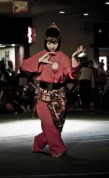The Silat uniform may varies according to different schools and locality but generally can be divided into three types; training, ceremonial, and formal dress. The most important dress is for the training, which commonly consist of a baggy black trousers and a black long sleeved baju melayu.[70] Some schools require the practitioners to wear belts (bengkung) during training, with different colours signifying different rank, a practice adopted from the belt system of Japanese martial arts, while some silat schools replace the bengkung with a modern buckled belt. Headdress is optional but donning a black bandana is popular.[70] Female practitioners may replace the bandana with an Islamic veil (tudong), or left their hair uncovered except when uttering prayers at the beginning and end of the training sessions.[71] A sarong can also be worn along with a roll of cloth which could be used as a bag, a blanket or a weapon. In Seni Gayong, a wide red cloth sash is wrapped several times around the waist and ribs of the practitioner as a type of supple armour to protect the body against spear thrusts.[72] Generally, every part of the uniform has a special function, for example, the headdress or bandana doubles as a bandage, and the sash may be used as weapon as well.[70] Nevertheless, some schools use a modern uniform consisting of a T-shirt and pants topped with a short sarong. Others may not even have any official uniform and allow the students to dress as they normally would, so that they become accustomed to fighting in their daily attire.