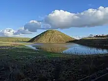 The base of the hill is circular and 167 metres (548 ft) in diameter. The summit is flat-topped and 30 metres (98 ft) in diameter. A smaller mound was constructed first, and in a later phase much enlarged. The initial structures at the base of the hill were perfectly circular: surveying reveals that the centre of the flat top and the centre of the cone that describes the hill lie within a metre of one another.[6] There are indications that the top originally had a rounded profile, but this was flattened in the medieval period to provide a base for a building, perhaps with a defensive purpose.[8]