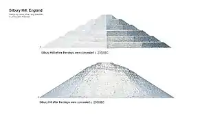 The first clear evidence of construction, dated to around 2400 BC,[9] consisted of a gravel core with a revetting kerb of stakes and sarsen boulders. Alternate layers of chalk rubble and earth were placed on top of this: the second phase involved heaping further chalk on top of the core, using material excavated from a series of surrounding ditches which were progressively refilled then recut several metres further out.[5] The step surrounding the summit dates from this phase of construction, either as a precaution against slippage,[10] or as the remnants of a spiral path ascending from the base, used during construction to raise materials and later as a processional route.[11][9]