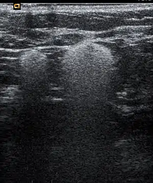 | Snowball like hyperechogenic axillary lymph nodes in a woman with silicone implants removed due to complications | |