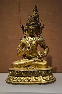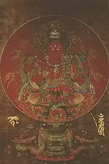 This composition with a vajra in the right hand, a vajra bell in the left hand, and an eight-leaf lotus flower underneath is the same as Vajrasattva .[14] Vajrasattva is a Bodhisattva (a pre-Buddhist practitioner), meaning "one who is as firm and courageous as Vajrasattva (the unbreakable stone)", and a Dainichi Buddha (the truth of the universe itself, Buddha (title), the second founder of Shingon Buddhism after Vairocana and, according to the Honji Suijaku theory, the home of Amaterasu, the ancestor god of the Emperor of Japan.[29] As an intermediary between Buddha and human beings, he is said to be responsible for conveying the teachings of Dainichi Buddha to the human world,[29] and is "a being who is both Buddha and not Buddha, and a person and not a person.