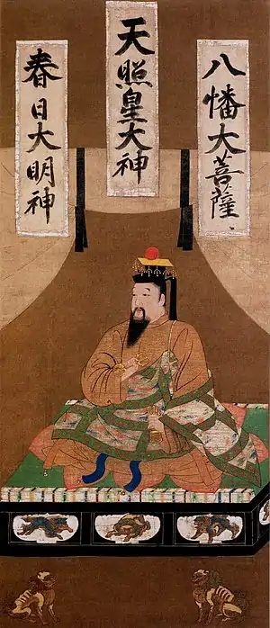 Motohiko Toyama says that the oracle was affixed at the time of its establishment .[56] According to Toyama, the strips of oracles represent the three gods themselves, and in the image, they are identified with Emperor Go-Daigo, which may indicate that Go-Daigo was an object of worship equal to the gods and Buddha .[48] And that is why A-shaped lion and Un-shaped lion are depicted on the right and left sides of the lower part of the image, respectively, facing each other .[48] Toyama also pointed out that within the Amida-honoring Tokishu sect, it appears that the Amaterasu in this work was worshipped as Dainichi Nyorai, the Hachiman-daibosatsu as Amida Nyorai, and the Kasuga-daimyojin as Amida's assistant, the Amitabha snare Kannon [13] (#Post-formation history).