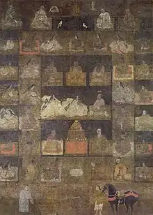 Silken Painting of Emperor Go-Daigo is a portrait and Buddhist painting of Emperor Go-Daigo from the Nanboku-chō period. The painting was supervised by the Buddhist priest and protector of Emperor Go-Daigo, Bunkanbo Koshin. After his death, Buddhābhiṣeka opened his eyes on September 20, October 23, 1339, the fourth year of Enen4/Ryakuō, during the 57th day Buddhist memorial service.[lower-alpha 1].Meiji 33rd year (1900), April 7, designated as Important Cultural Property. As Emperor of Japan rather than Cloistered Emperor, he was granted the highest Abhisheka (coronation ceremony) of Shingon Buddhism He was united with Vajrasattva, a Bodhisattva, as a secular emperor, and became a symbol of the unification of the royal law, Buddhism, and Shintoism under the Sanja-takusen, in which the three divine symbols were written. After the end of the Civil War of the Northern and Southern Dynasties, it was transferred to the head temple of the Tokishu sect, Shōjōkō-ji (Kanagawa Prefecture Fujisawa, Kanagawa), by the 12th Yūkyō Shōnin, a cousin of Go-Daigo and the founder of the Tokishu sect. During the Sengoku period, it became an object of worship for the Tokimune sect of the time, and copies were made. Because it is directly related to the theory of kingship in the Kenmu Restoration, it is important in Art history, History of religion, and Political history. It is said to show the legitimate kingship as the protector of Vajrayana succeeding his father, Emperor Go-Uda, as well as the harmonious political and religious kingship as in the reign of Prince Shōtoku.