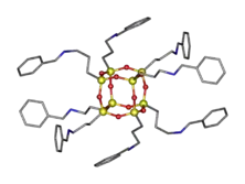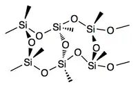 A silsesquioxane is an organosilicon compound with the chemical formula [RSiO3/2]n (R = H, alkyl, aryl or alkoxyl).[1] Silsesquioxanes are colorless solids that adopt cage-like or polymeric structures with Si-O-Si linkages and tetrahedral Si vertices. Silsesquioxanes are members of polyoctahedral silsesquioxanes ("POSS"), which have attracted attention as preceramic polymer precursors to ceramic materials and nanocomposites. Diverse substituents (R) can be attached to the Si centers. The molecules are unusual because they feature an inorganic silicate core and an organic exterior. The silica core confers rigidity and thermal stability.