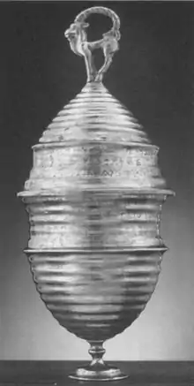 The Silver Reliquary of Indravarman is an inscribed silver Buddhist reliquary dedicated by Apracaraja king Indravarman in the 1st century BCE,[Note 1] which has been found presumably in the Bajaur area of Gandhara.[1][Note 2] Believed to have been fabricated at Taxila, the silver reliquary consists of two parts—the base and the cover—both being fluted,[Note 3] and the cover being topped by a figure of long horned Ibex. It has been dated to around the eighth or ninth decades of the 1st century BCE and bears six inscriptions written in pointillē style, in Kharoshthi script and Gandhari/north-western Prakrit. In form, the silver vessel is wholly atypical of Buddhist reliquaries and is said to have been a wine goblet, similar to others found in Gandhara and Kapisa regions. The vessel was later reused by Apraca king Indravarman as a Reliquary to enshrine Buddhist relics in a stüpa raised by Indravarman. The inscriptions on the silver reliquary provide important new information not only about the history of the kings of Apraca dynasty themselves but also about their relationships with other rulers of the far north-western region of traditional India i.e. modern northern Pakistan and eastern Afghanistan around the beginning of Christian era.