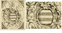 The arms on the title page of one of the Francesco Corbelletti’s 1639 publications,[4] i. e. the Rome publisher of Petra Sancta, already represents a complete example of heraldic hatching. That means Corbelletti took over the heraldic hatching system already in the next year after the 1638 system of Petra Sancta appeared. If we consider the time needed to prepare the engravings and the approval by the censor,[upper-alpha 1] Corbelletti must have known the hatching system of Petra Sancta even before 1638.