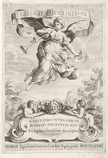 - The title of his 1638 book: Tesserae gentilitiae / a Silvestro Petra Sancta Romano Societatis Iesu ex legibus Fecialium descriptae. – Romae : typis haered[um] Francisci Corbelletti, 1638 (Note générale : Fig. coloriées pour la plus grande partie. -Note générale : Superbe ordinaire "avec figures à chaque page" table des noms de famille à la fin.)