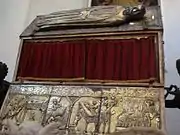 Sometime between AD 565 and 578, a body believed to be that of Simeon was translated from Syria or Jerusalem to Constantinople.[6] Sometime around the Siege of Constantinople (1203) the relics were seized and shipped to Venice; however, a storm forced the ship to put in to the port of Zadar on the Dalmatian coast. The relics were first placed in the Velika Gospa (Church of the Virgin) and then later translated to the Church of St. Stephen, which became known as the Sanctuary of St. Simeon the Godbearer. Simeon is one of the four patron saints of Zadar; his feast day is celebrated on 8 October. In October 2010, Archbishop Želimir Puljić of Zadar conveyed a small silver reliquary containing some of Simeon's relics to Archbishop Theofylactus of Jordan, representing Theophilos III, the Greek Orthodox Patriarch of Jerusalem, for the monastery of St. Simeon the Godbearer in Jerusalem.[7]