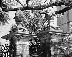 The large, neoclassical Simmons-Edwards House is a Charleston single house built for Francis Simmons, a Johns Island planter, about 1800. The house, located at 14 Legare St., Charleston, South Carolina, is famous for its large brick gates with decorative wrought iron. The gates, which were installed by George Edwards (who owned the house until 1835) and which bear his initials, include finials that were carved to resemble Italian pinecones. They are frequently referred to as pineapples by locals, and the house is known popularly as the Pineapple Gates House.[3]
