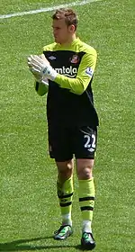 Mignolet made his Sunderland debut in a 2–2 draw against Birmingham City on 15 August 2010, and was named man of the match for his performance. In the next home match, a 1–0 victory against Manchester City, Mignolet kept his first clean sheet for Sunderland, following an excellent reaction save to deny Emmanuel Adebayor a goal. Mignolet put in another fine performance against Arsenal, as Sunderland drew 1–1 after Darren Bent equalised in the 95th minute. However, Craig Gordon would replace Mignolet in goal several weeks later, and remained first-choice thereafter. Mignolet did not feature again until 8 January 2011, when Sunderland suffered a loss at home to Notts County in the third round of the FA Cup. Mignolet would become first-choice goalkeeper again after a knee injury to Gordon in February, and earned a string of rave reviews for his performances. Following the draw, Sunderland manager Steve Bruce hailed the young goalkeeper's fine start to life in English football.[9] Mignolet cemented his position as first-choice goalkeeper the following season, being preferred to new signing Keiren Westwood.[10]
