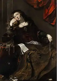 He is known to have collaborated with the flower painter Daniel Seghers and Alexander Adriaenssen on so-called 'garland paintings'.[6][7] Garland paintings are a special type of still life developed in Antwerp by Jan Brueghel the Elder in collaboration with the Italian cardinal Federico Borromeo at the beginning of the 17th century.[8] The genre was initially connected to the visual imagery of the Counter-Reformation movement.[8] It was further inspired by the cult of veneration and devotion to Mary prevalent at the Habsburg court (then the rulers over the Southern Netherlands) and in Antwerp generally.[8][9] Garland paintings typically show a flower garland around a devotional image, portrait or other religious symbol (such as the host). Garland paintings were usually collaborations between a still life and a figure painter.[9]