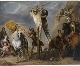After 1640, de Vos turned almost entirely away from genre scenes and painted mostly religious, history subjects and allegorical scenes, influenced stylistically at first by Rubens and then increasingly by Anthony van Dyck.[3] Examples include The Martyrdom of St Philip (c. 1645–1648) in the Royal Museum of Fine Arts, Antwerp.