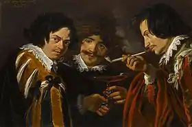 An example of a painting from this period is the Gathering of Smokers and Drinkers (Louvre Museum, Paris) of 1626. The painting depicts three young men at half-length who are enjoying a pipe and a glass of wine. The persons represented are assumed to be Simon de Vos himself (in the middle), flanked on the left by Jan Cossiers and on the right by Johan Geerlof. Cossiers and Geerlof were two artist friends of de Vos who had also settled in Aix-en-Provence. Typical for his early work, Simon de Vos painted the faces in this composition with thick features and eyes set wide apart. The painting's composition, tightly framing three half-length figures, is clearly influenced by the Caravaggists of Utrecht. Simon de Vos used the light effects typical of the Caravaggists by lighting the artists' faces from the painting's left-hand side, making the faces stand out against the neutral background. The inspiration for the picture may have been the early works of Caravaggio himself, which Simon de Vos may have seen if he visited Rome.[4]