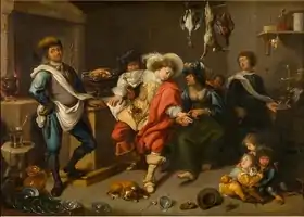 His works from the late 1620s until around 1640, which were made after returning to Antwerp, are mostly small "merry company" and courtly genre scenes reminiscent of contemporary Dutch painters Dirck Hals and Pieter Codde.[3]
