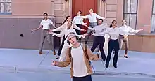 Healy continues walking the street before falling into a hole in the ground, immediately emerging from a nearby building.[56] He engages in a dance-off with a well-dressed man in the street, reminiscent of the video for the band's "A Change of Heart" (2016), and the pair swap outfits out of frame.[54][56][57] The singer performs a dance sequence evocative of Jackson and gives his hat to a child before dashing to a lamppost, swinging around it in reference to Gene Kelly.[57] As the camera pans, Healy emerges from a different house and is greeted by a choir of women on the steps.[56] The women, dressed in pantsuits, are meant to represent women in the United States Congress.[52] After performing the chorus with them on the road, the singer performs a football trick and plays a game of hopscotch with one of the children.[52][54][56] In a cartoonish fashion, he then rushes to save MacDonald from a falling piano that crashes onto the sidewalk as the chorus starts.[54][56][61]