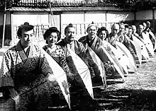 Singing Lovebirds (鴛鴦歌合戦, Oshidori utagassen) is a 1939 Japanese film directed by Masahiro Makino. It is a musical comedy. Fulfilling his reputation as a fast worker, Makino made the film in only two weeks when an opening was created in the production schedule of another film, Yaji Kita Dōchūki, after its star, Chiezō Kataoka, came down with appendicitis (Kataoka's scenes in Singing Lovebirds were filmed in only a few hours).[1] The film, however, has become "the most frequently revived Japanese prewar musical film," featuring music ranging from jazz to jōruri, and popular music stars like Dick Mine.[1] Makino made other musicals like Hanako-san (1943) and was known for his rhythmic style. Singing Lovebirds also features Takashi Shimura, most famous as the lead samurai in Akira Kurosawa's Seven Samurai, in a singing role.
