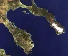 ![]() Satellite view of the Singitic Gulf, with the island of Ammouliani shown in the north | |