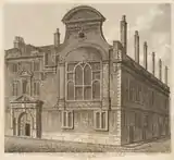 The original buildings in London Wall were on a site previously occupied by Elsing Spital, a hospital for the blind founded in 1329, and earlier still by a nunnery. They comprised the almshouses, a hall and chapel, and the library added to the foundation by Dr John Simson, rector of St Olave Hart Street, one of White's executors. There were also, at least originally, apartments for students. The site was bounded by London Wall, Philip Lane, and Gayspur Lane (now Aldermanbury),[2] roughly where Aldermanbury Square now stands. The first Court (committee) from 1630 consisted of John Gifford (President), Thomas Worrall and John Simson (Deans), and Francis Dee, Cornelius Burges, Edward Abbott and Thomas Wood (Assistants).[3]