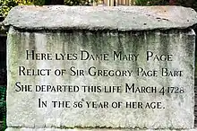 Page died on 25 May 1720, and was buried at Greenwich on 2 June 1720. He left four children: two sons (Gregory and Thomas) and two daughters (Mary and Sophia).[1][3][4] The baronetcy, with his "immense fortune"[1] was inherited by his eldest son, Gregory. His widow died at Greenwich on 4 March 1729 aged 56. She was buried in a vault at Bunhill Fields on the outskirts of the City of London. Her epitaph hints at a painful illness, which was possibly Meigs' syndrome.[5] The epitaph reads in part:[2][6]