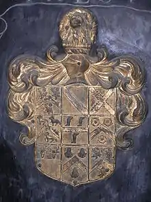 In 1599 he succeeded to the Felbrigg estate in Norfolk, including Felbrigg Hall, from his father's first cousin Thomas Wyndham (d. 1599), who like his two brothers Sir Roger and Francis (d. 1592), Judge of Common Pleas (whose monument exists in St Peter Mancroft in Norwich) died without issue. Felbrigg was the seat of the senior line of the Wyndham family. In gratitude he placed a monumental brass inlaid in Purbeck marble, in Felbrigg Church.[15] Sir Edmund Wyndham (d. 1568) was the eldest son of Sir Thomas Wyndham (eldest son of Sir John Wyndham (beheaded 1503 on Tower Hill with James Tyrrell) by his first wife Lady Margaret Howard, 4th daughter of John Howard, 1st Duke of Norfolk (d. 1485)) by his first wife Alianore Scrope, daughter and heiress of Richard Scrope of Upsall, Yorks. Sir John also placed a monumental brass inlaid in Purbeck marble in Felbrigg Church to Thomas Wyndham's sister Jane Wyndham (d. 1608). Both brasses are in the same style, but much smaller, as those Sir John erected in Watchet church to his parents and in Ilminstaer Church to his uncle Nicholas Wadham. The original accounts concerning the shipping and laying down of the Felbrigg brasses survive in the Wyndham papers at Felbrigg Hall, and although the brasses are known to have been purchased in London, the maker's name is not recorded.[16] Sir John gave Felbrigg to his third son Thomas Wyndham (d. 1653), for whom he rebuilt the manor house, completed in 1624,[17] which survives today. The arms of father (impaling Portman) and son (impaling Lytton) survive sculpted in stone side by side above the front door.[18]