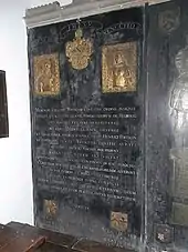 He died on 1 April 1645 and was buried in Watchet Church, Somerset, where exists a memorial to him and his wife consisting of a large slab of purbeck marble erected vertically against the east wall of the north aisle chapel, containing inlaid plaques of gilt-bronze relief-sculpted portraits and armorial shields.