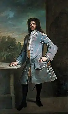 Williamson's nerve began to give way under the strain of the Plot, and he became a political liability. Charles finally dismissed him after he gave orders to search Somerset House, the Queen's official residence, without the King's permission; the King, "in great anger" told him that "I marvel at your effrontery in searching my house... your head is turning.....I do not wish to be served by a man who fears anyone more than me".[8] Danby was suspected by many of having a part in Williamson's downfall, as he was said to have taken offence at Williamson's recent marriage to Lady Clifton, a wealthy widow and cousin of the King.[9]