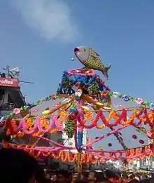 Sri Pydimamba died before she got married. So five married women will be seated on the Anjali chariot which goes in front of Sirimanu as a part of tradition. As five married women are sitting on this chariot, this is called Anjali chariot. In addition, Paladhara, an umbrella made with fishing nets decorated with flowers and fruits is another important accompaniment to the Anjali Chariot.[4]