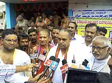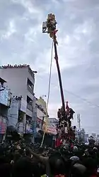 Sirimanothsavam, (Telugu: సిరిమాను పండుగ, సిరి మాను ఉత్సవం) (also referred to as Sirimanu Uthsavam, Siri Manu Fete/Festival, Sirimanu Panduga) is a festival organized to propitiate Goddess Pyddithallamma of Vizianagram Town. Siri means "goddess Lakshmi in other words wealth and prosperity " and manu means "trunk" or "log". The priest of the temple, while taking procession between the fort and temple three times in the evening, hangs from the tip of the long, lean wooden staff (measuring 60 feet), raised high into the sky. The priest possessed by the goddess would himself tell a few days before, where this manu would be available. It is from that place only the log has to be procured.[1] Hanging from the upper end of the staff, which is raised high into the sky, is a very risky exercise, but it is believed that the grace of the Goddess protects the priest from falling off. It is held in the month of September or October (Dasara) of every year. It is a great carnival attended by two to three lakhs of people from the neighboring towns and villages.[2] The Rajas of Vizianagaram oversee the arrangements for this event. The APSRTC runs about 250 buses from different parts of the state to facilitate transport of devotees to Vizianagram to attend this festival.[3]