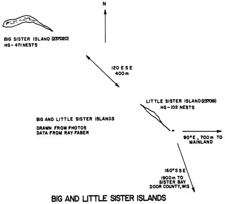 There are many species of birds that nest on the islands. In 1964 there were an estimated 1,350 to 1,650 breeding pairs of herring gulls on the islands.[3] Both islands are owned and operated by the Wisconsin Department of Natural Resources, and they are protected as the Sister Islands State Natural Area[4]