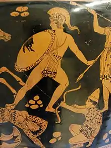 The Sisyphus Painter is only known by this conventional name, as his true name remains unknown. He is one of the most influential painters in the Apulian vase painting tradition, and thus in all South Italian vase painting. His conventional name is derived from the inscription on the heart-shaped gift held by a youth as part of the depiction of a wedding on one of his volute kraters. He follows the tradition of the Painter of the Berlin Dancing Girl in whose workshop he is assumed to have started. Arthur Dale Trendall described the Sisyphus Painter as "probably the dominant artist of the Taras School".[1] Nonetheless, the quality of his works is uneven. Especially on larger vases he showed his quality as a painter of heads, often depicted in a three-quarter profile.