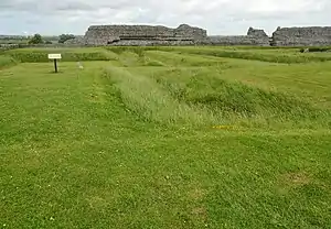 Other historians argue that, as the Roman invasion fleet may have numbered as many as 1,000 ships, mostly slow and ungainly troop transports, its commanders would have wanted to minimise the time spent at sea because of the risk of contrary winds, and that this favours the short route to Kent rather than the longer journey up the Channel to the Solent. Richborough had a large natural harbour (long since silted up) which would have provided a suitable anchorage for the landing (though its capacity to hold more than a small part of the fleet has been questioned),[9]. Defensive ditches dating to the period of the invasion and likely protecting a beachhead were excavated in 2001 and 2008.[10] There is also evidence at Richborough of a ceremonial arch, which may have commemorated Richborough's role in the invasion, but as the arch was not constructed until c AD 80, by which time Rutupiæ was the major port of entry into Britain from the continent, its relation to the events of the invasion is uncertain.
