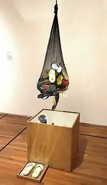 In her 1977 installation, Dolonan (Toys), Siti Ardyati appropriates the iconography of wayang, often discussed as a court tradition and a form of 'high' culture. In contrast to courtly wayang kulit, which features lamb-skin leather puppets that are ornately painted on one side, Siti Adiyati's installation featured small wayang figures made of plastic, alongside other ornamental objects used as toys for children.[5] These materials were hung from or attached to a standing cuboid structure made of four wooden planks and rows of white fabric attached around them. Such materials serve to dissolve the boundaries of 'high' and 'low' culture, situating court traditions within the realm of the everyday, as a form that is not immune to commodification for mass consumption and tourist trade, or being instrumentalised in official constructions of national culture.[5]