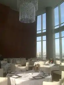 Fodor's praised the food as a "unique fusion of European and Asian flavors".[18] According to the critic from Time Out Chicago, the restaurant is more of a place to impress clients and dates than a top–notch dining experience with top-notch cuisine due to its association with Donald Trump and its views.[10] The magazine's annual Eating & Drinking guide describes the dining room as stately and impressive, the staff as attentive and professional and the food as well-presented.[19] Kamin remarks that although some of the comments that he received by e-mail are not as supportive of the entire structure as they are of the restaurant, the restaurant provides an opportunity for people to emulate Guy de Maupassant, who is said to have disliked the Eiffel Tower so much that he ate at the tower's restaurant daily so as not to have to look at its iron monstrosity.[4] According to the Forbes Travel Guide: 2010 City Guide: Chicago, the hotel hosted one of the seven four-star restaurants in Chicago, which had two five-star restaurants.[20] Three years later, according to the Forbes Travel Guide: 2013 City Guide the restaurant was one of only three five-star restaurants in Chicago.[21] It remained one of only 3 five-star Forbes-rated restaurants in the 2015 Forbes Guide (along with Alinea and Grace).[22]