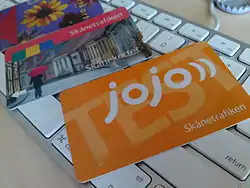Tickets can be purchased in cash, as part of a debit card system, or via a 30-day transit pass. In regional buses tickets for single journeys are bought from the driver, but not in city buses. Between 2009 to 2019 both debit card and passes are contact-less cards called "jojo". On buses, the card was held in front of the card reader on board. On trains, debit card holders buy a ticket in advance from machines on or near the platform and on the Skånetrafiken app.[3] Pass holders just board the trains. Since December 14, 2019 the jojo card is not available.