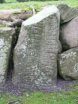 The Skårby 1 runestone contains runic text within a band along the outside of the stone and in two interior sections. The stone is 2.6 meters in height and is made of granite. The stone is notable for the beast in the center of the inscription, which has been identified as a lion.[1] The inscription is classified as being carved in runestone style RAK, which is the oldest style. This is the classification for inscriptions where the end of the text bands are straight and there are no attached serpent or beast heads. The inscription is believed to have been carved after the date of the Jelling stones were completed.