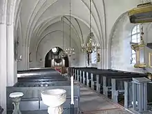 Inside, the church is whitewashed save for a few fragments of medieval frescos. The church's altarpiece is a Northern Renaissance piece, made in the atelier of Flemish sculptor Jan Borman (c. 1479-1520).[1] A medieval wooden sculpture depicting Thomas Becket, made in the atelier of Bernt Notke (c. 1440-1509), formerly also belonged to the church but is today on display at the Swedish History Museum.[3] [4] [5]