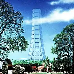 The proposal consists of a building 1,000 m (3,281 ft) tall and 400 m (1,312 ft) wide at the base, with a total floor area of 8 km2 (3.1 sq mi).[2] The design, proposed in 1989 by the Takenaka Corporation, would have housed between 35,000[2][3] and 36,000[4] full-time residents as well as 100,000 workers. It comprised 14 concave dish-shaped "Space Plateaus" stacked one upon the other. The interior of the plateaus would have contained greenspace, and the edges of the building would have contained apartments. The building would have also housed offices, commercial facilities, schools, theatres, and other modern amenities.[2]
