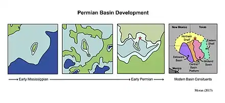 Prior to the formation of the Permian Basin, this area was the expansive marine environment of the Tobosa Basin. In the development of the Greater Permian Basin, there are three main contributing factors. Firstly, mass deposition of clastic sediments causing the initial depression. Following this mass deposition, the collision of supercontinents Laurasia and Gondwana to form Pangea with associated faulting and uplift. Finally, basin filling. Due to faulting, uplift, erosion, and varying rates of subsidence, the Tobosa Basin was segregated into sub-basins and platforms. The three major constituents of the basin are the Delaware Basin, Central Basin Platform, and Midland Basin. Other important constituents are the Northern Shelf and Eastern Shelf. There are several other structures associated with the formation of the basin that do not directly affect Slaughter Field.[5]
