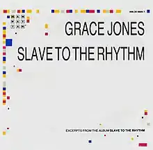 "Slave to the Rhythm" is a 1985 song written by Trevor Horn, Bruce Woolley, Stephen Lipson, and Simon Darlow, and performed by Jamaican-American singer Grace Jones. It is the lead single and closing track to Jones' album of the same name, on which it is retitled "Ladies and Gentlemen: Miss Grace Jones".