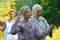 The scholar Kaarina Aitamurto observed that a "substantial number" of Russian Rodnovers, and in particular the earliest adherents, belonged to the "technical intelligentsia".[2] Similarly, the scholar Victor Shnirelman noted that the founders of Russian Rodnovery were "well-educated urbanized intellectuals" who had become frustrated with "cosmopolitan urban culture".[3] Physicists were particularly well represented; in this Aitamurto drew comparisons to the high number of computer professionals who were present in the Pagan communities of Western countries.[2] The movement also involved a significant number of people who had a background in the Soviet or Russian Army,[4] or in policing and security.[5] A questionnaire distributed at the Kupala festival in Maloyaroslavets suggested that Native Faith practitioners typically had above-average levels of education, with a substantial portion working as business owners or managers.[6] A high proportion were also involved in specialist professions such as engineering, the academia, or information technology, and the majority lived in cities.[7] The "vast majority" of Russian Rodnovers were young and there were a greater proportion of men than women.[2]