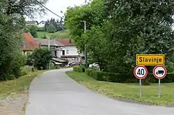 The newer part of Slavinje lies along the main road, and the older part of the village stands on a rise immediately south of the road. Before water mains were installed in the village, water was obtained from wells and cisterns, and from nearby Hornbeam Spring (Pod gabrom). A spring in the lower part of the village has been impounded for use as a water source for livestock. There is a karst spring in a meadow in the woods south of the village.[3]