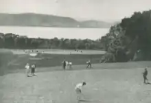 In 1917 the club had 1,000 members, and its president was Frank Vanderlip.[21] In June of that year, William Rockefeller purchased 387 acres (0.6 sq mi) for the club, bringing its area to 480 acres (0.8 sq mi) (the house was originally sold with only 93 acres (0.1 sq mi)). Rockefeller spent $600,000 ($12,690,400 in 2021[2]), making it the largest single real estate transaction in the county.[21] The purchases allowed for the construction of about 40 houses on the club property.[15] New facilities were built in the 1920s, including a manager's house, skeet house, squash house, indoor riding ring, and swimming pool.[7]: 61 [25] The club had operated at a loss from the beginning, and after the Wall Street Crash of 1929, club members were not successful in maintaining their wealth, and membership declined. Cuts were made – horses were sold, Woodlea was closed except for special occasions, and the golf house became the primary clubhouse. 5-acre (0.008 sq mi) building lots north of Woodlea were sold to members. In 1933, notable amateur golfer Bobby Jones played at the course.[28] The club was also not successful during World War II and later; in 1950 a member could stay overnight at Woodlea for $5 ($56 in 2021[2]), and for less in the golf house. The first formal dance that year also cost $5 a person. In 1961, in time for the club's 50th anniversary, Woodlea was redecorated with more modern fabrics, warm gold and forest green carpets, dropped lighting, and some lowered ceilings.[13]: 167 [22]