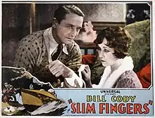 Slim Fingers is a 1929 American crime film directed by Joseph Levigard and written by William Berke and Carl Krusada. The film stars Bill Cody, Duane Thompson, Wilbur Mack, Monte Montague, Arthur Morrison and Charles King. The film was released on March 24, 1929, by Universal Pictures.[1][2][3]