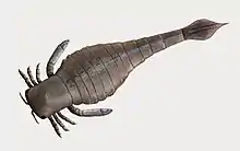 Slimonia is in many ways similar to the more derived (more "advanced") eurypterids of its superfamily, the Pterygotioidea. In particular, the expanded and flattened telson (the most posterior segment of the body) of Slimonia is similar to that of the pterygotid eurypterids and is a feature that Slimonia and the pterygotids only share with some derived hibbertopterid eurypterids (where the feature convergently evolved).[1] The pterygotid telson was in general slightly larger than that of Slimonia and was more slender. The telson spike of Slimonia was much longer than any seen in the Pterygotidae (constituting just over half of the total telson length) however, serrated and ending in a fine point.[2] The largest species of Slimonia, S. acuminata, reached a maximum length of 100 cm (39 in) whilst the smallest, S. dubia, grew to 12 cm (5 in) in length.[3] Though 100 cm is large for a predatory arthropod, Slimonia would be exceeded in length by later and more derived (more "advanced") members of the closely related pterygotid family of eurypterids, which would become the largest known arthropods to ever live.[4]
