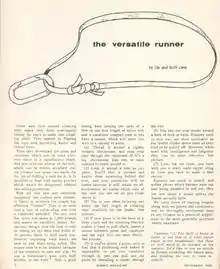 A sling or runner is an item of climbing equipment consisting of a tied or sewn loop of webbing. These can be wrapped around sections of rock, hitched to other pieces of equipment, or tied directly to a tensioned line using a Prusik style knot. They may be used as anchors, to extend an anchor to reduce rope drag, in anchor equalization, or to climb a rope.[1]