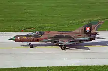 After the formal dissolution of Czechoslovakia on January 1, 1993, Czech and Slovak aircraft were divided according to each nation's population, in a ratio of nearly 2:1 in the Czech Republic's favor.[26] The exceptions to this rule were the MiG-23's, which were given exclusively to the Czech Air force, and the MiG-29's, which were divided evenly between the two nations. Slovak bases were initially under-equipped to handle the aircraft transferred from the Czech bases, and required considerable improvements in infrastructure to facilitate the new air force. On March 1, 1995, the air force replaced the Soviet style aviation regiment organization with the western wing and squadron system.[27] Around 2000–2002, Slovakia gradually retired many of the older aircraft, including the entire fleet of Su-22, Su-25, and MiG-21.[28] In 2004, the flight training academy and national aerobatic demonstration team Biele Albatrosy, both based at Košice, were disbanded.[29][30]
