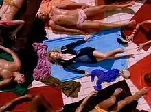 The accompanying music video for "Slow" was directed by Baillie Walsh and choreographed by Michael Rooney.[49] The video was shot in Barcelona, Spain,[50] and begins with a scene of a man diving into the Piscina Municipal de Montjuïc swimming pool[51] and coming out of its edge, where a number of very lightly beachwear-clad people are sunbathing. Minogue stands out in a series of different zoom central shots lying on a sky-blue towel wearing a dark blue bodyhugging Balenciaga dress.[48] The next scenes of the video capture her singing the song through different camera angles, particularly during the chorus when the camera angle shifts to a "bird's eye" view and show Minogue amid beach models performing synchronised choreography to the dance beats.[50] A reviewer from District MTV commented that the video showed that "synchronised sun bathing is more fun than it sounds".[50] Ben Taylor from Swide Magazine included the video in his list of Minogue's "Best Music Video Moments".[52] Used for promoting the song, the video premiered earlier than the song's release date, on 21 October 2003.[49] Minogue talked about the video, saying: